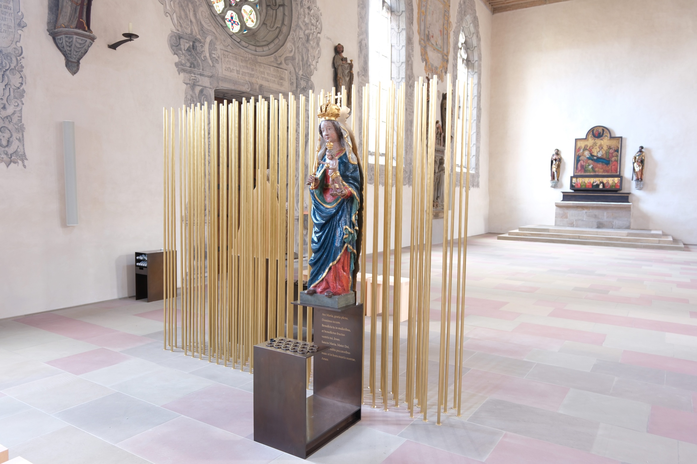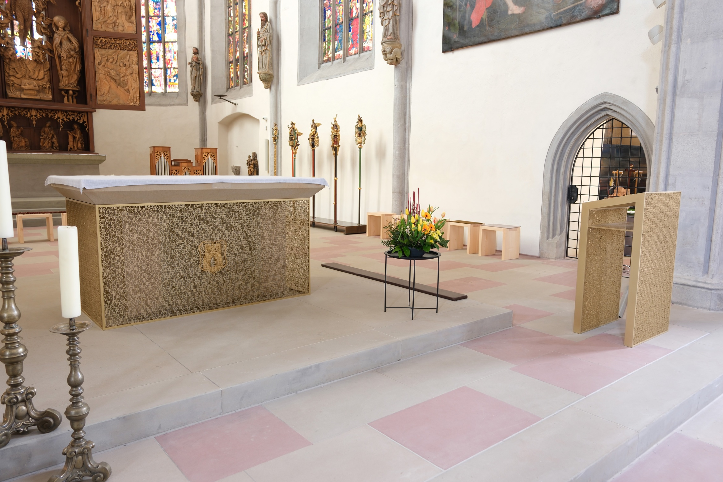 Der Volksaltar wurde in der Größe angepasst und korrespondiere nun besser mit dem bedeutenden Riemenschneideraltar im Hintergrund. Die Ummantelung des Zelebrationsaltars mit einem filigranen Netz aus biblischen Texten spiele mit den unterschiedlichen Lichtsituationen im Gotteshaus. Mit der Verwendung von Schriftstellen finde man hier ein protestantisches Gestaltungsprinzip, das den Worten den Vorzug zu Heiligenfiguren und Bildern gebe.